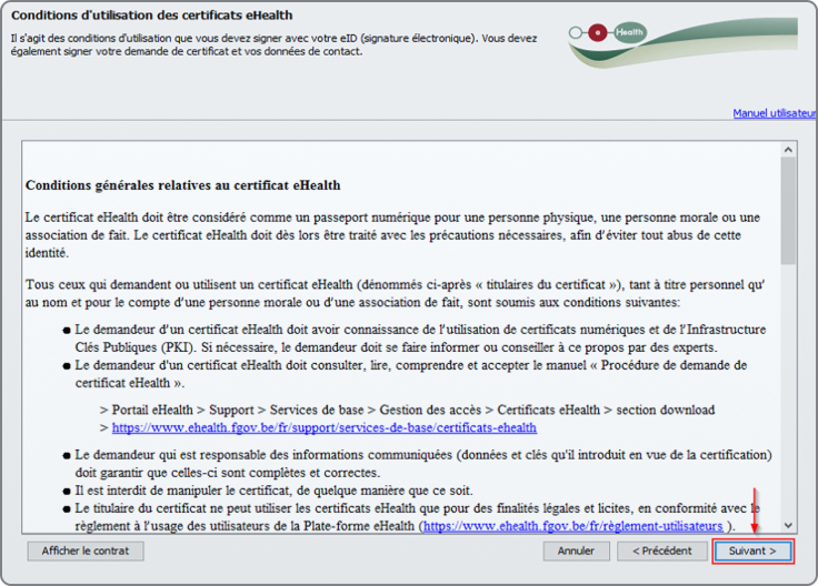 À présent, vous avez atteint la page d'accueil du gestionnaire de certificat. Vous y trouverez une reprise des points mentionnés précédemment, auxquels vous devez accorder une attention particulière, comme expliqué dans la section "préparation pour le renouvellement du certificat eHealth". Pour continuer, veuillez appuyer sur le bouton "suivant".