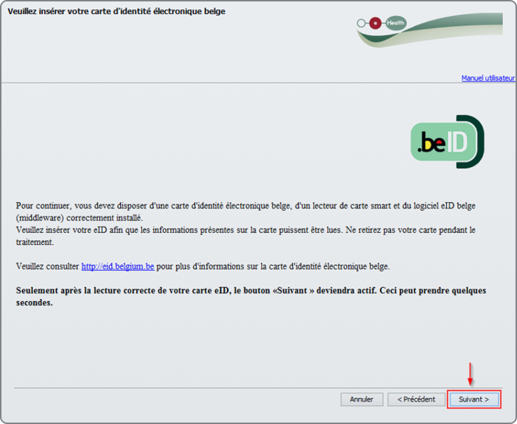 Insérez votre eID dans le lecteur. Si la carte n'est pas correctement placée dans le lecteur de carte, le bouton suivant ne sera pas accessible et restera grisé. Une fois que l'eID est correctement insérée dans le lecteur, appuyez sur « Suivant ».