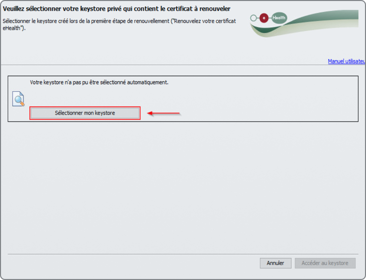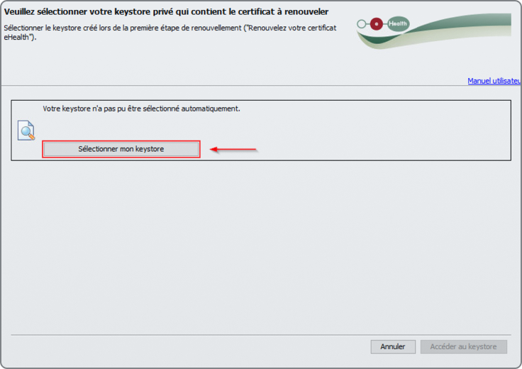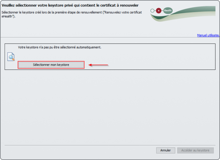 Cliquez sur le bouton « Sélectionner le Keystore » et choisissez votre certificat eHealth renouvelé.
