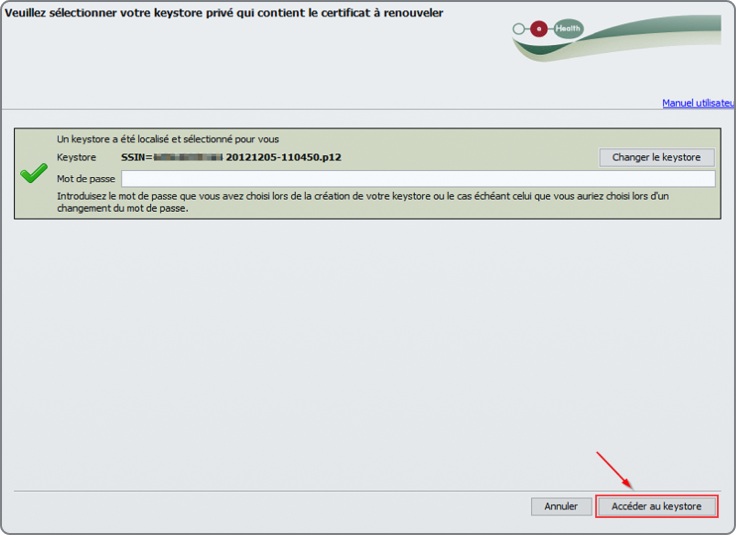 Ensuite, saisissez le mot de passe de votre certificat eHealth, puis appuyez sur le bouton "Ouvrir keystore".