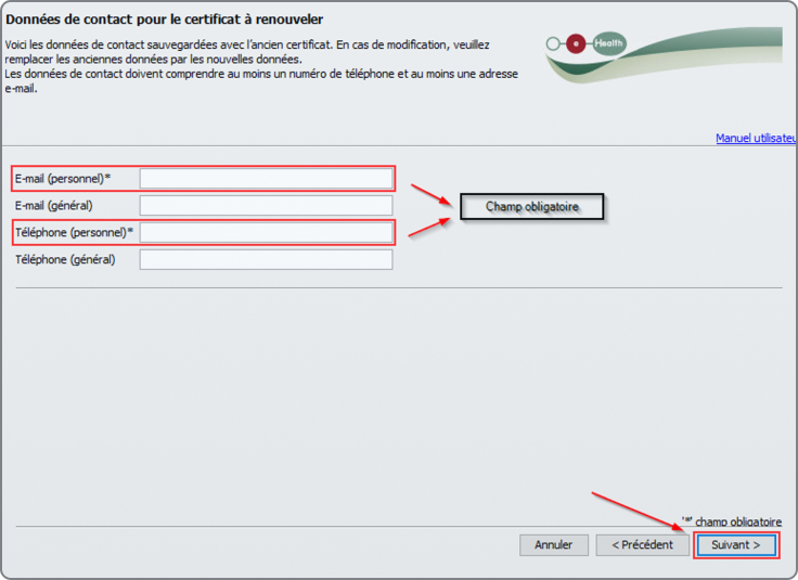 À présent, vous devez fournir au moins une adresse e-mail et un numéro de téléphone. Ces informations personnelles seront utilisées pour l'envoi de rapports par l'eHealth ou le gouvernement. Après avoir rempli ces champs, appuyez sur « Suivant ».