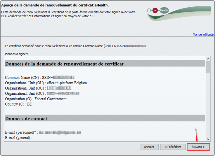 Avant de signer la demande de renouvellement du certificat à l'aide de votre eID, vous avez la possibilité de vérifier vos données sur l'écran suivant. Ensuite, appuyez sur « Suivant ». Si vous remarquez que certaines données ne sont pas correctes, vous pouvez revenir en arrière pour apporter les modifications nécessaires en appuyant sur le bouton « Précédent ».
