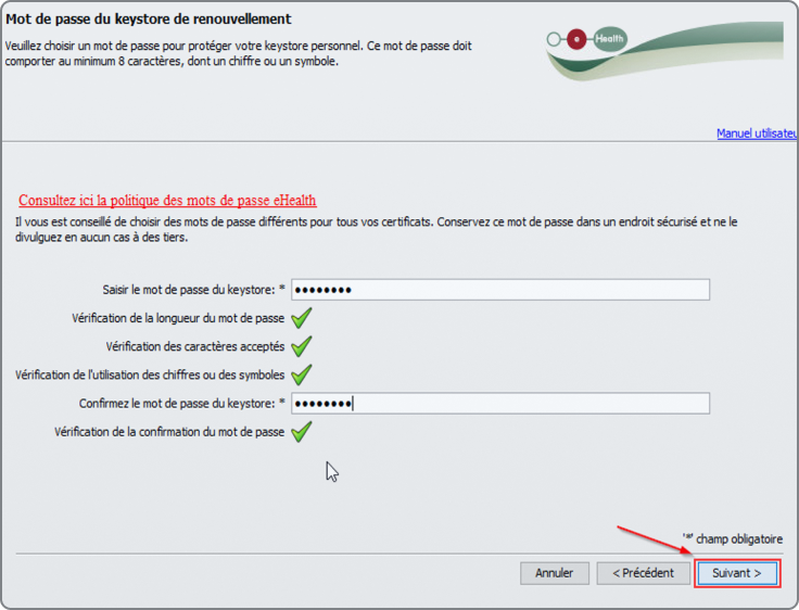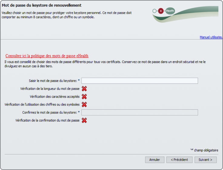 Un certificat eHealth est un fichier sécurisé placé sur votre ordinateur, protégé par un mot de passe que vous choisissez. Sur l'écran suivant, vous pouvez sélectionner un mot de passe pour votre certificat.