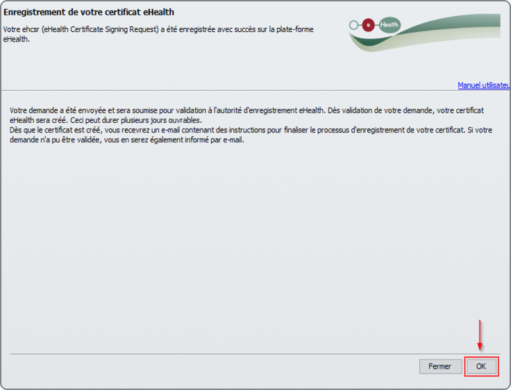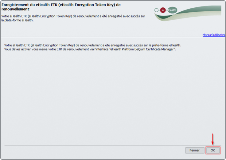 Votre certificat eHealth renouvelé est maintenant complété. Cliquez sur le bouton "OK".