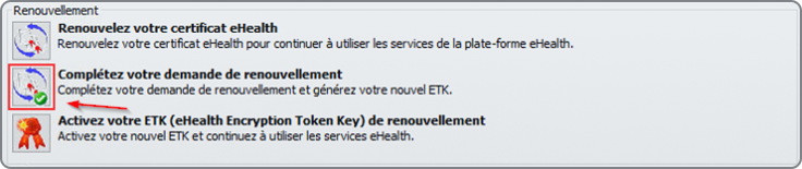 Redémarrez le gestionnaire du certificat eHealth comme décrit dans le chapitre « Démarrer le gestionnaire du certificat eHealth », puis appuyez sur le bouton « Compléter le renouvellement ».