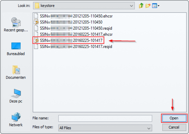 Dans l'exemple suivant, vous pouvez observer deux certificats eHealth sur votre ordinateur : l'ancien certificat eHealth créé le 12 octobre 2012 et le nouveau certificat créé le 8 janvier 2016. Sélectionnez le certificat le plus récent et appuyez sur le bouton « Ouvrir ».