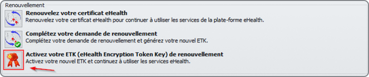 Pour finaliser le processus, il ne vous reste qu'à activer le certificat eHealth renouvelé. Redémarrez le gestionnaire du certificat eHealth comme indiqué dans la section "Démarrer le gestionnaire du certificat eHealth", puis cliquez sur le bouton "Activer votre certificat eHealth renouvelé en ETK".