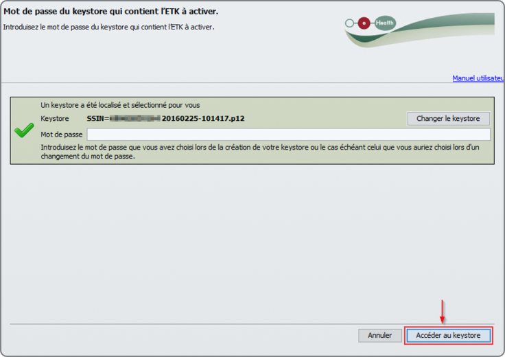Après cela, saisissez le mot de passe de votre certificat eHealth, puis appuyez sur le bouton "Ouvrir keystore".