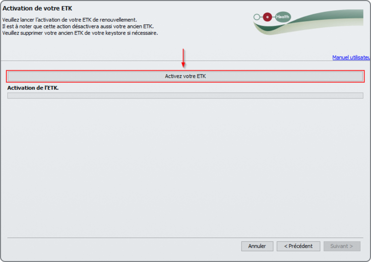 Cliquez sur le bouton "Activer votre ETK" pour finaliser le processus d'activation de votre certificat eHealth renouvelé.