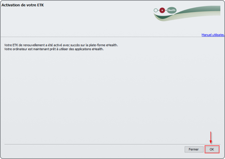 Votre certificat eHealth a été activé et renouvelé avec succès. Cliquez ensuite sur le bouton "OK".